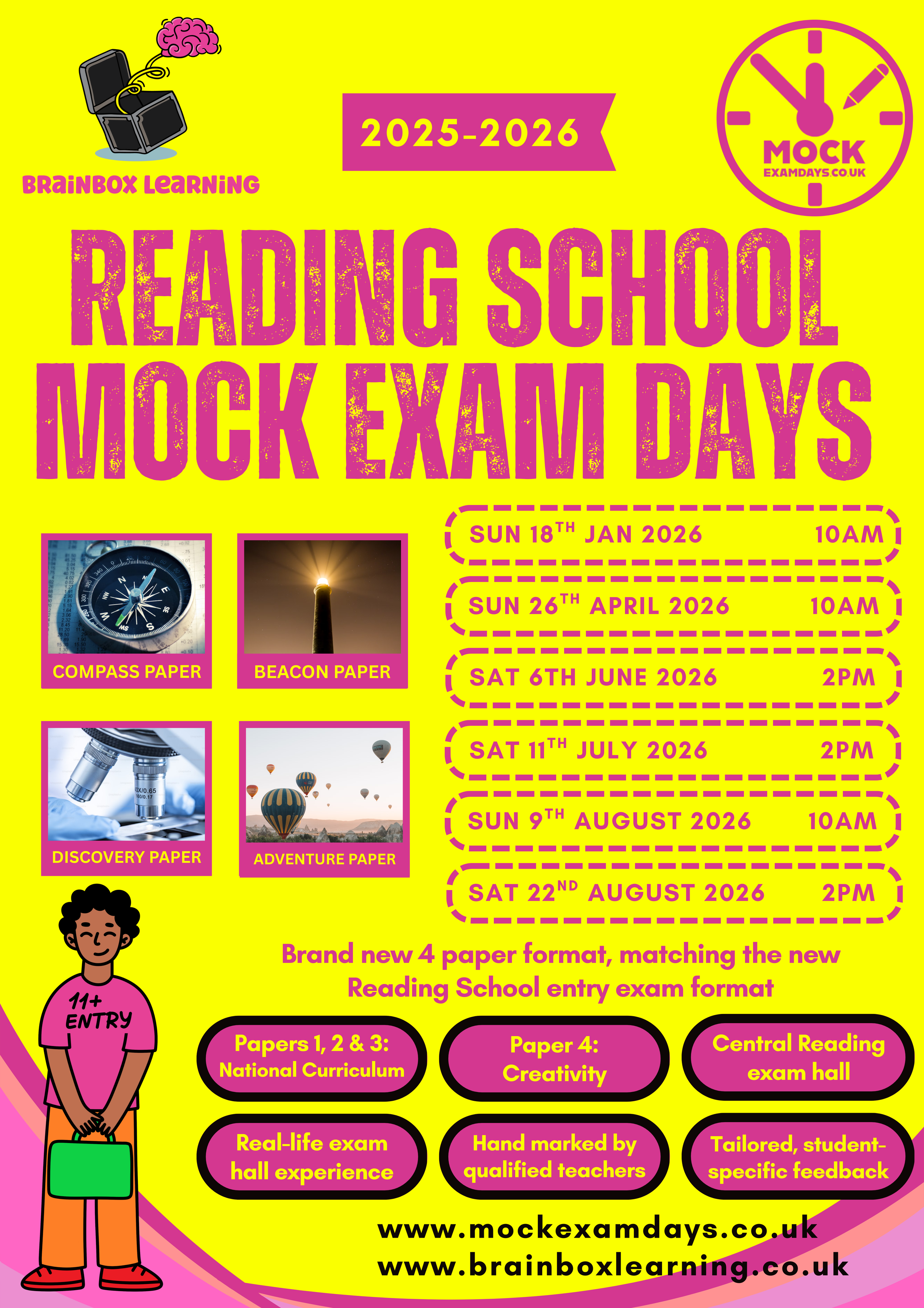 October 2025 update: As the majority of parents are already likely aware, Reading School launched a completely new format for its entrance exams, beginning with the September 2025 set of exams. All of the information in this guide has been updated to reflect this new four paper exam format. We also held a focus group in early October 2025, inviting 14 boys to provide us with their first hand feedback, having sat the new format exams in September 2025. Our specialist examination team, which includes examiners, alongside current and ex grammar school teachers, have created five brand new sets of mock papers, numbered 'RS1' to 'RS5'. All students sitting a mock exam with us will be sitting papers which match the new format (Adventure Paper, Beacon Paper, Compass Paper and Discovery Paper).